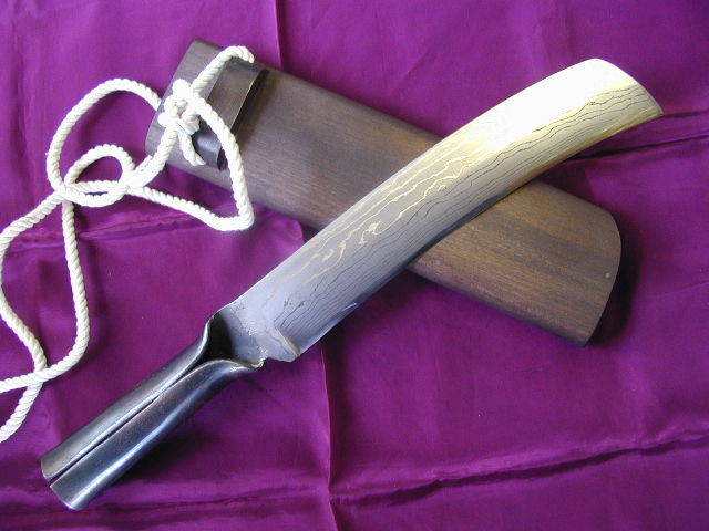 Kintaroame Echigo Santou, single bevel blade, Kintaroame steel blue, cherry blossom handle, wood sheath Blade length 250mm, thickness 6mm, width 42mm, total length 430mm JPY150,000 Kintaroame Kukuri Tou, double bevel blade, Kintaroame steel blue, leather handle, wood sheath Blade length 270mm, thickness 6.5mm, width 41mm, total length 425mm JPY170,000 Kintaroame rope cutting knife, single bevel blade, Kintaroame steel white, wood sheath Blade length 240mm, thickness 6.5mm, width 45mm, total length 405mm JPY160,000 Shipping your charge (Shipped Internationally) |